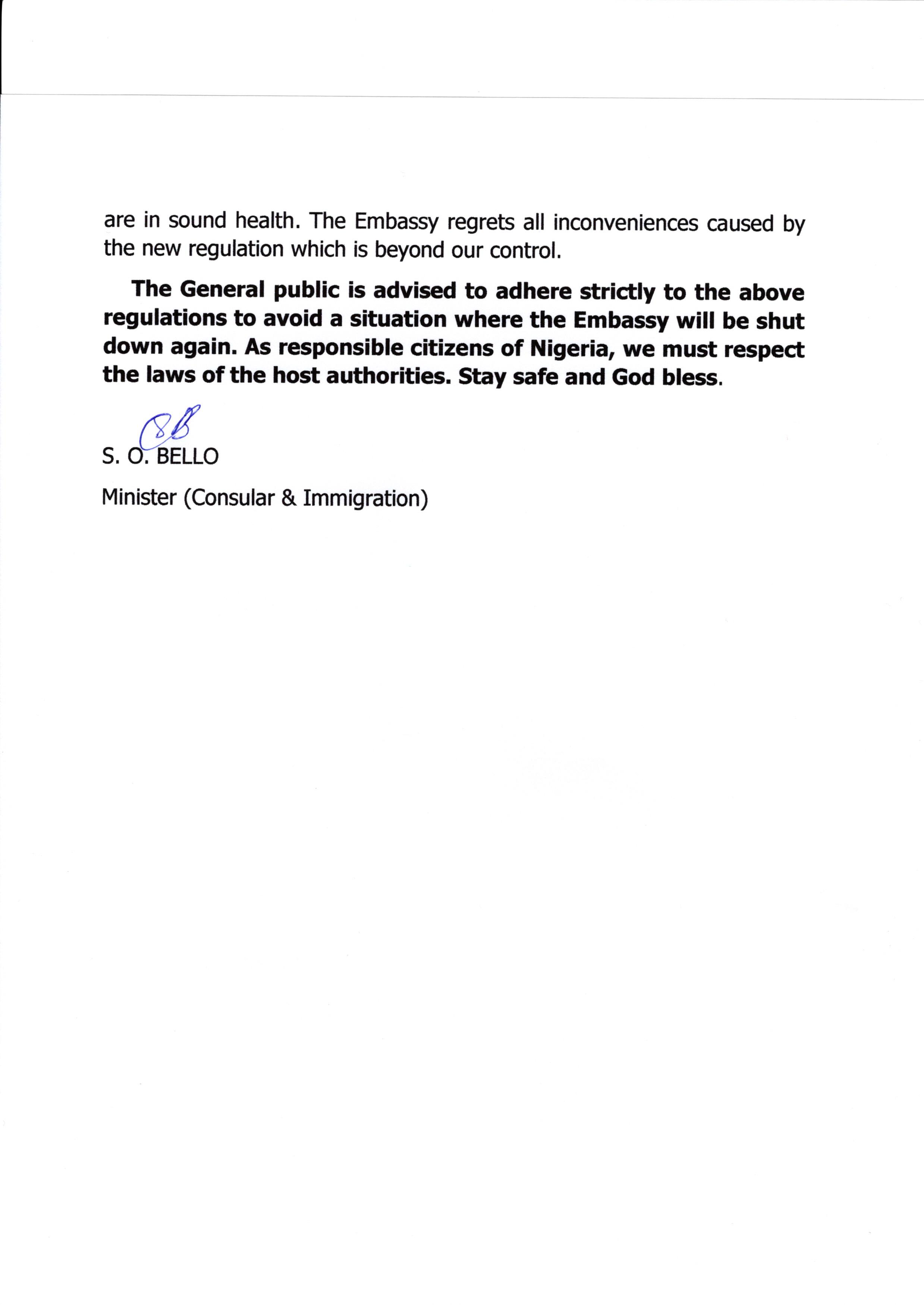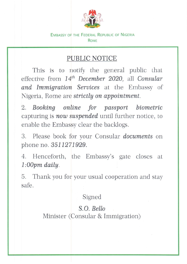 backlogs of several pending Appointments. - Consular and immigration Services: Starting from 14th Dec. 2020, all the services