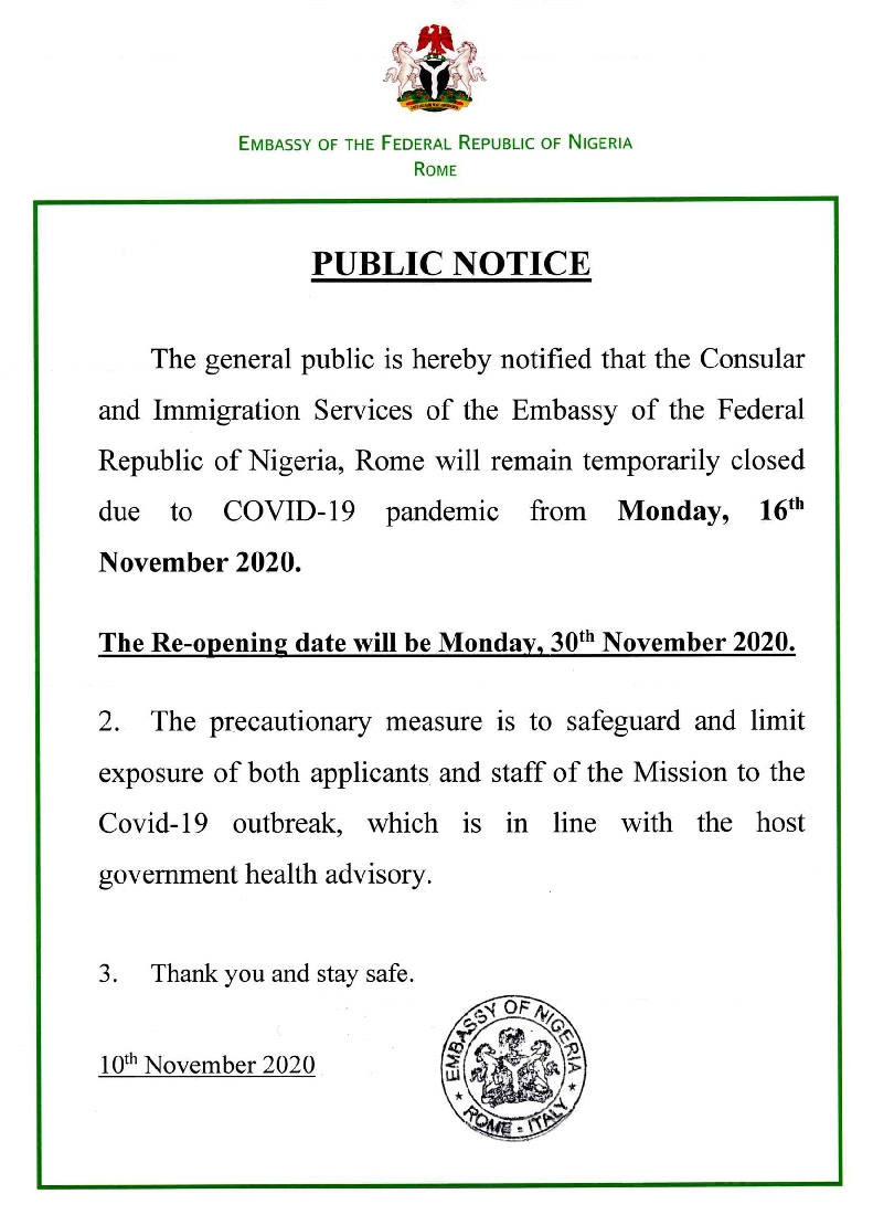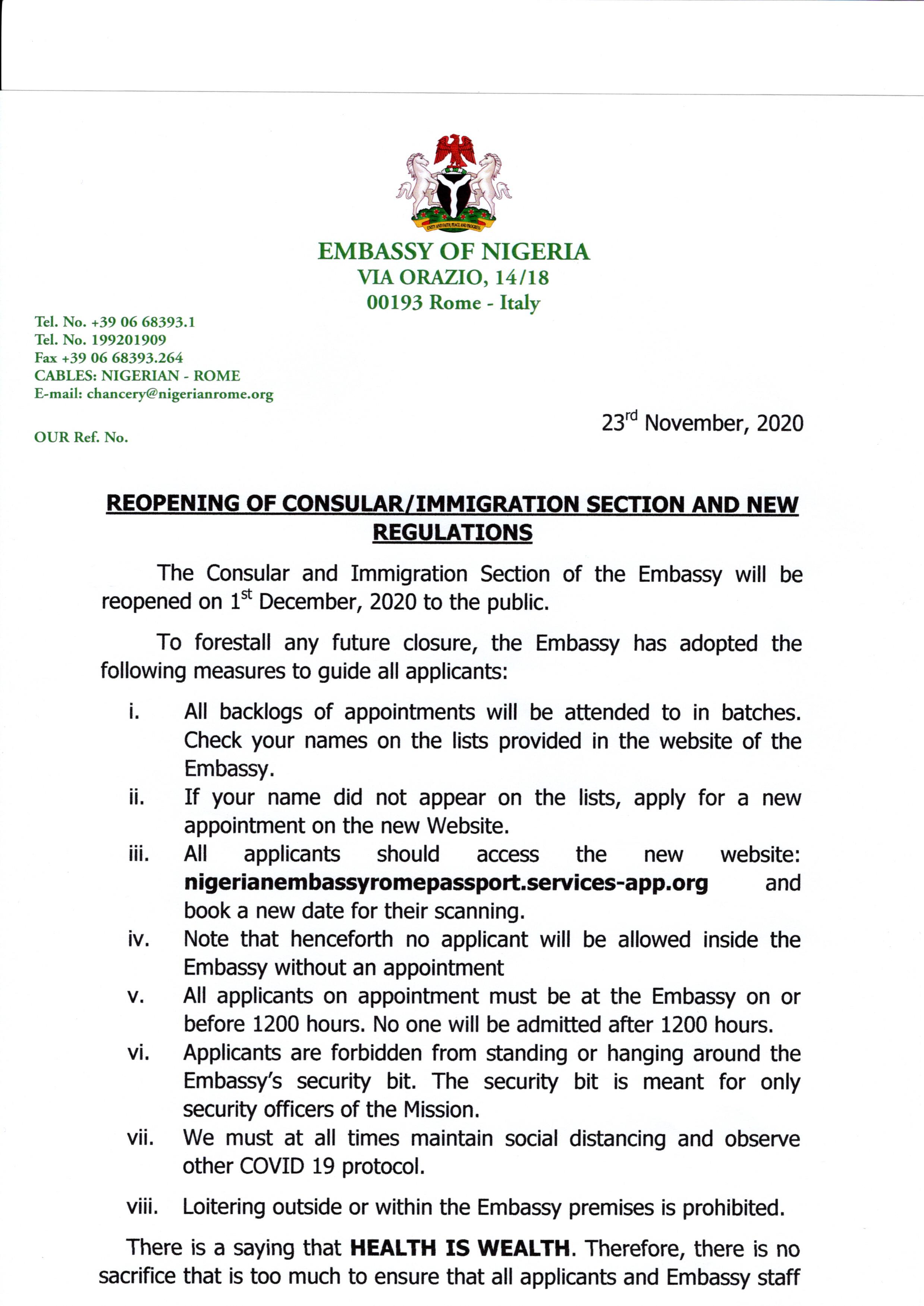 at the Embassy are strictly on Appointment. For Appointments call +39.351.127.1929. Henceforth, the Embassy's gate closes at 13:00 daily. -